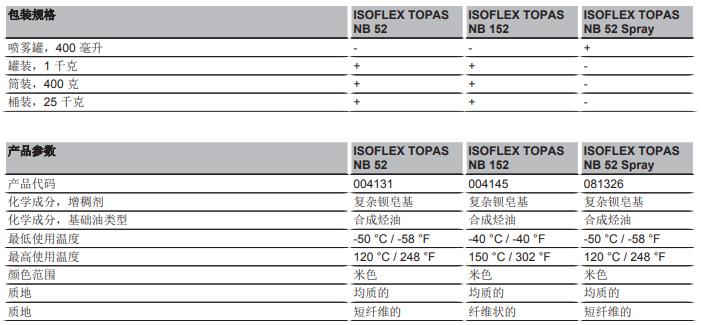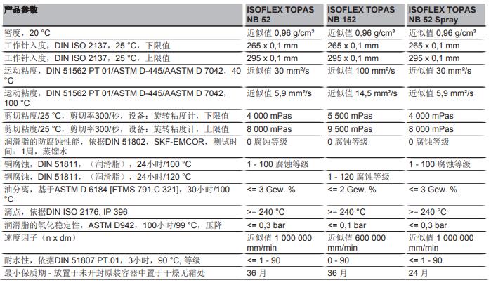 ISOFLEX TOPAS NB 52和ISOFLEX TOPAS NB 152是滾動(dòng)和滑動(dòng)軸承潤滑脂,它的化學(xué)成分是基于合成烴油和復(fù)合鋇皂劑。與其他的皂基增稠劑不同,用于ISOFLEX NB TOPAS 52和152的特殊的鋇皂基增稠劑提供了良好的承載能力,以及耐水和耐其他環(huán)境介質(zhì)的特性。這兩個(gè)產(chǎn)品具有良好的耐腐性以及抗氧化、抗老化穩(wěn)定性�?唆敳镜膹�(fù)合鋇皂基是經(jīng)過ELINCS認(rèn)證并且經(jīng)過GASG(全球汽車?yán)嫦嚓P(guān)協(xié)會(huì))批準(zhǔn)。